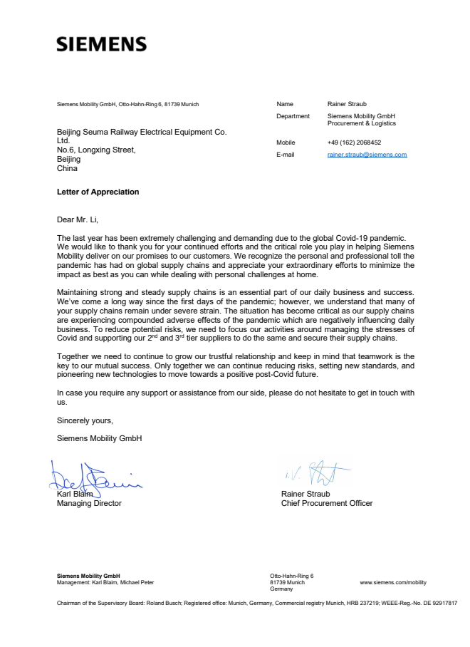 北京森瑪鐵路電氣設備有限公司成立于2007年6月,注冊資金330萬美元,是一家生產鐵路電氣化設備的德國獨資企業(yè),擁有獨立的進出口經(jīng)營權。公司占地面積6000㎡,辦公及生產面積3000㎡。2008年5月公司通過德國萊曼博士認證機構DIN EN ISO9001:2000認證。2011年1月通過ISO9001質量管理體系認證,于2018年11月成為北京市高新技術企業(yè)。